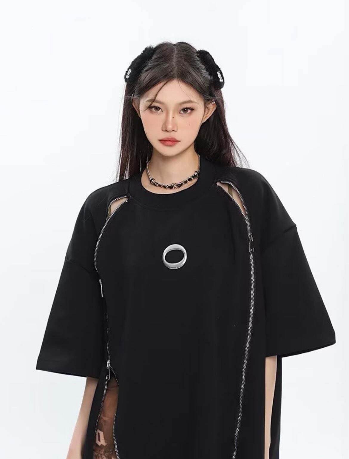 【2色】ダブルジッパーメタルシンプルルーズ Tシャツ