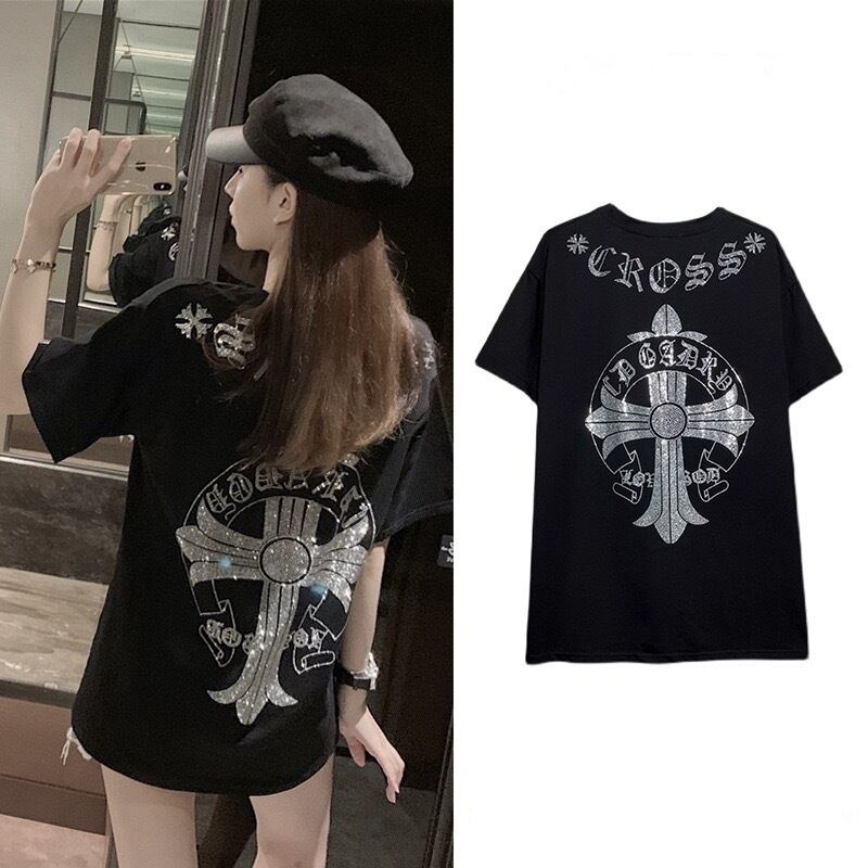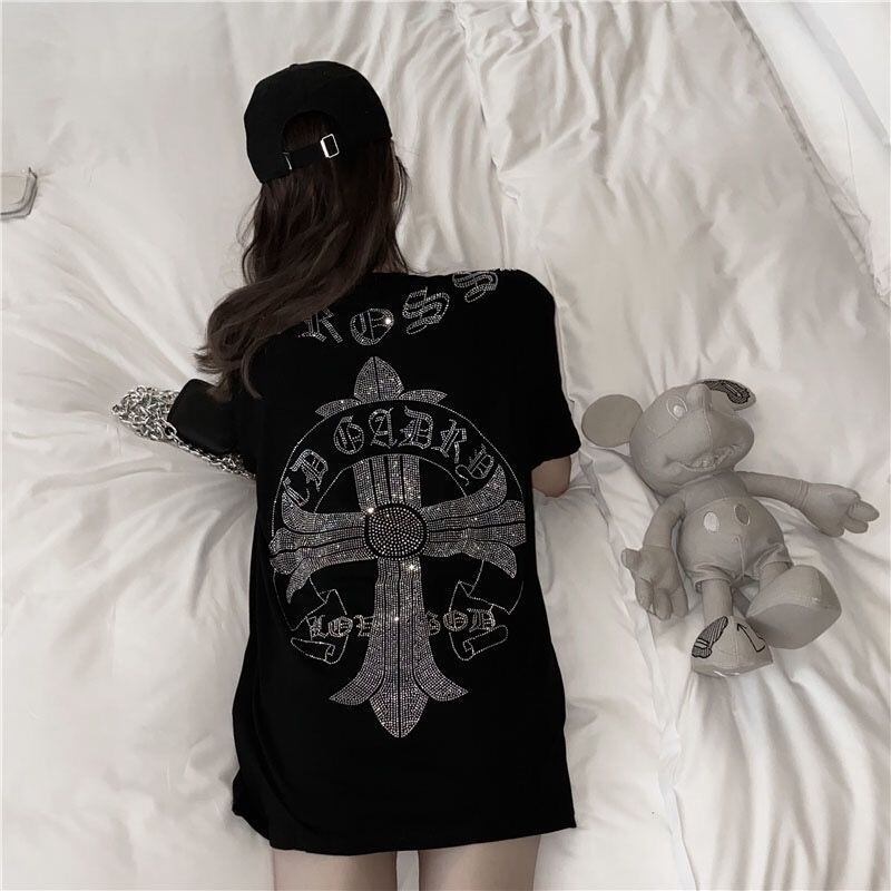 【2色】クロス ライン ストーン バック プリント Tシャツ 韓国ストリート